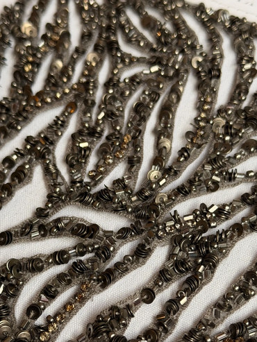 BRODERIE DE PAILLETTES ARGENTÉES, UN JEU DE LUMIÈRE CRÉÉ PAR L'ORIENTATION DES PAILLETTES.